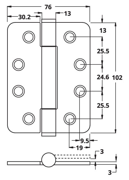 7730 Concealed Bearing Hinge Stainless Steel - Radius Corner - ANSI Hole - Satin Polished 102 x 76 x 3mm