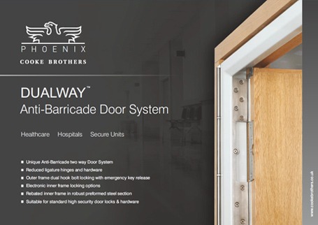 The DUALWAY Anti-Barricade Door System, designed and manufactured by Cooke Brothers, one of the UK's leading architectural door hardware manufacturers, is a purpose made door solution designed specifically to address the needs of today's challenging mental health and custodial environments, where the risk of ligature or self harm are prevalent.