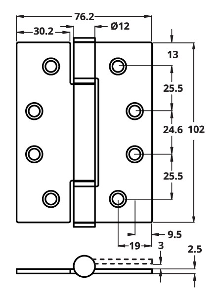 7230 Shrouded Bearing Hinge Stainless Steel - Square Corner - ANSI Hole - Satin Polished 102 x 76 x 2.5mm